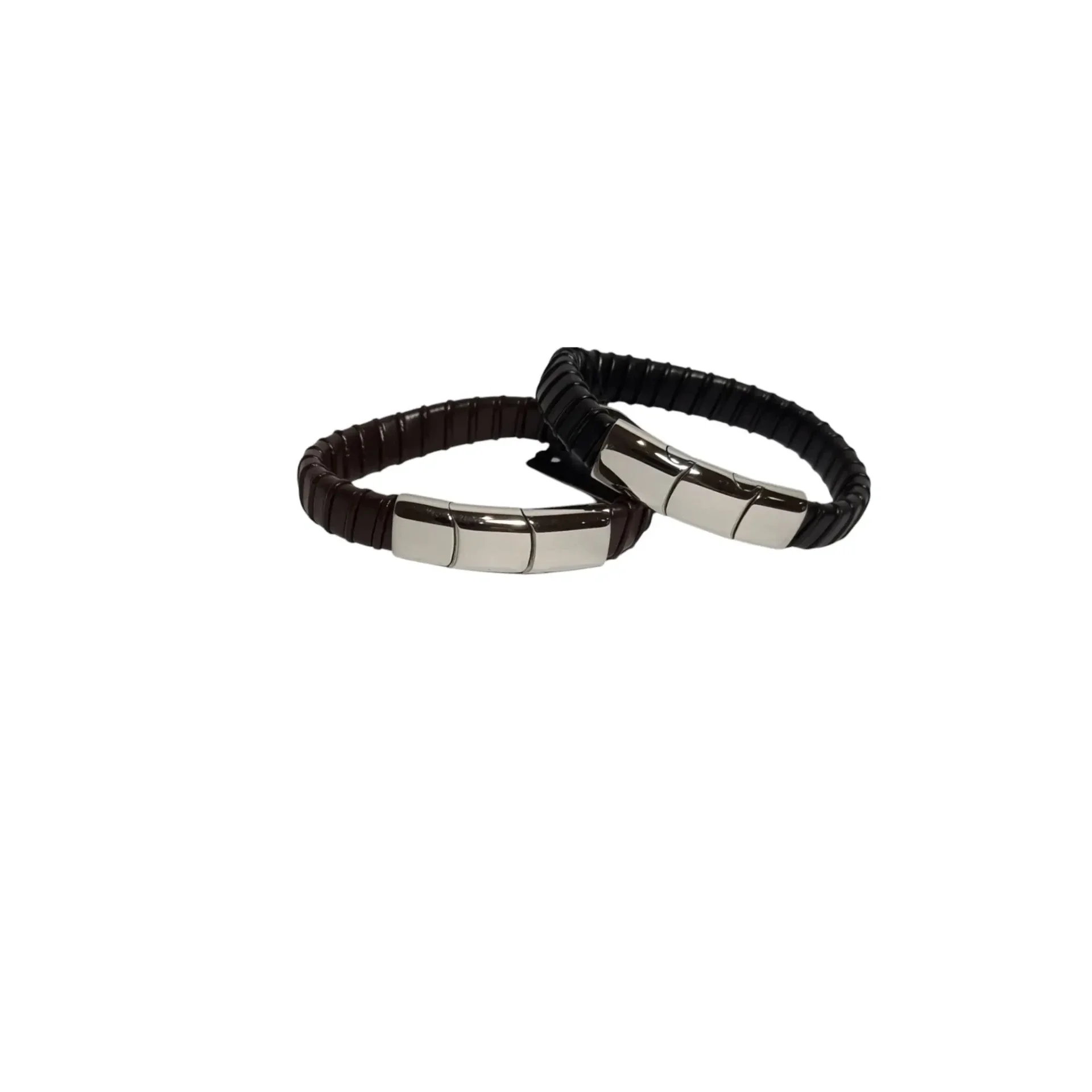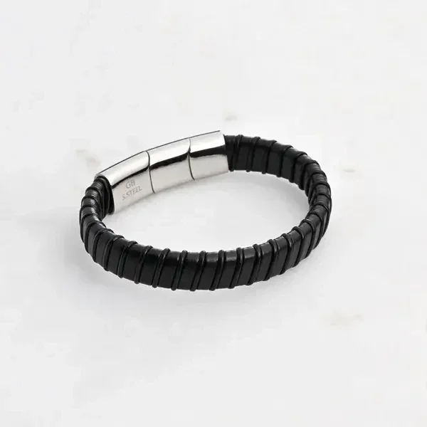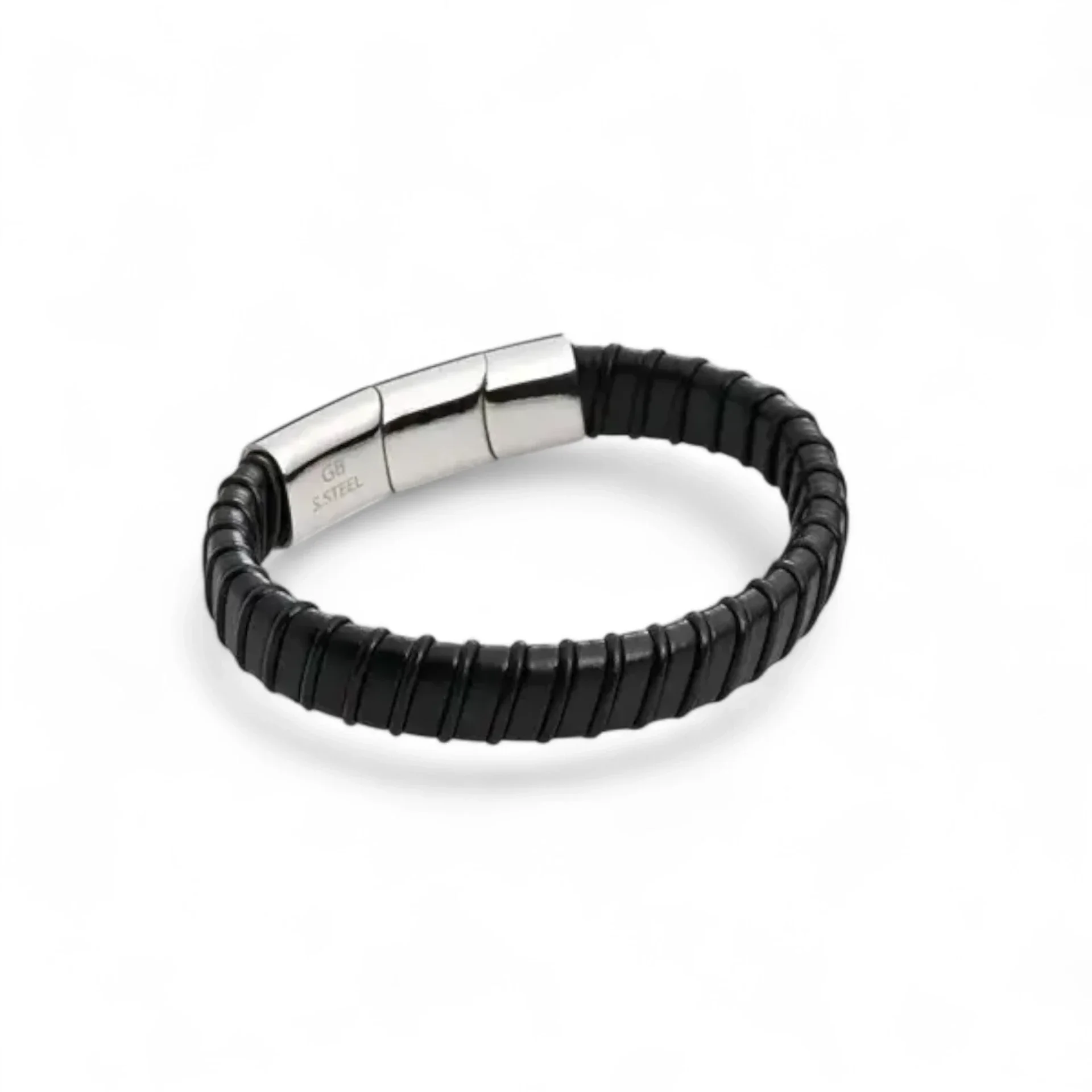 Bracelet pour homme en acier inoxydable simple GB, en argenté et en cuir torsadé.