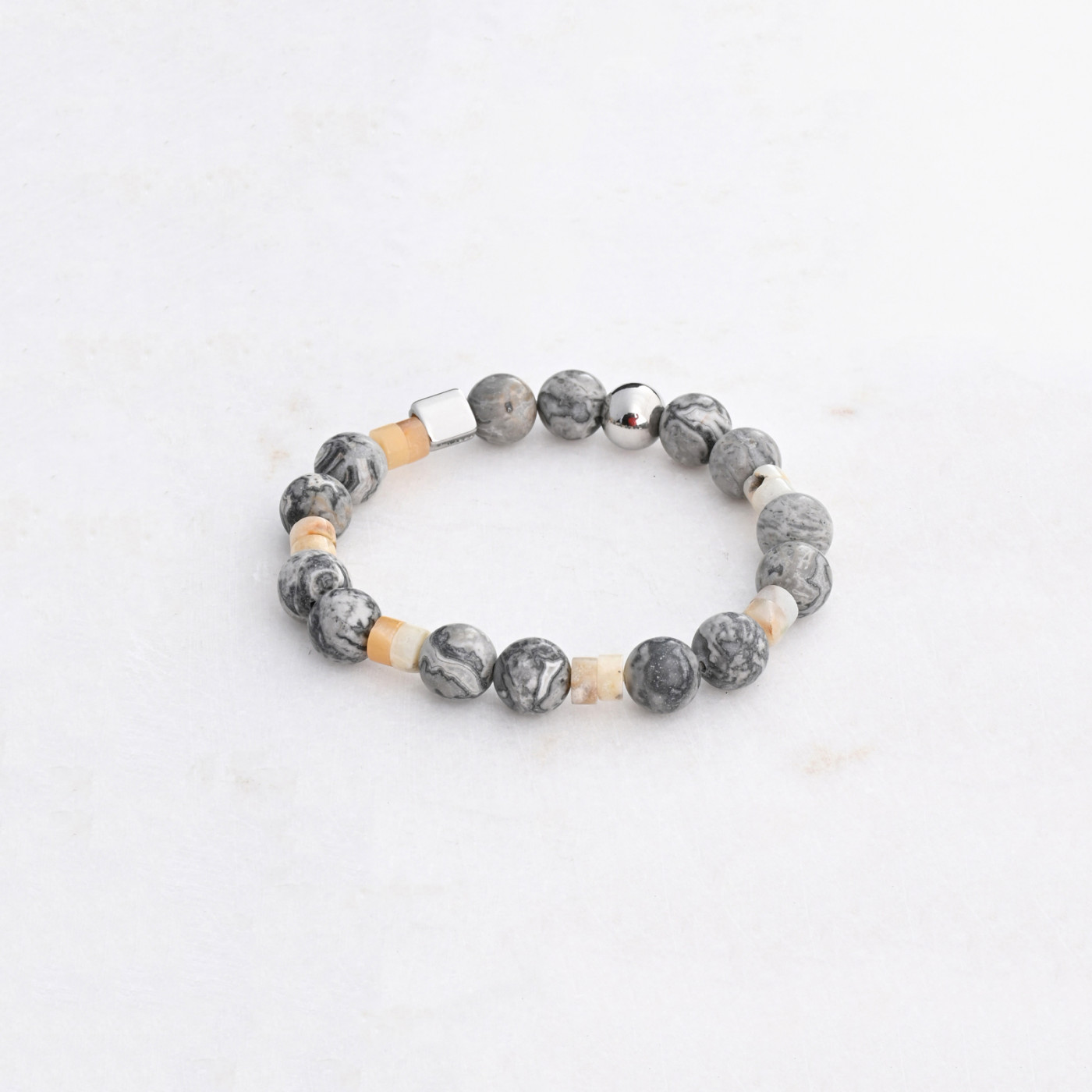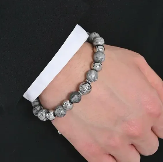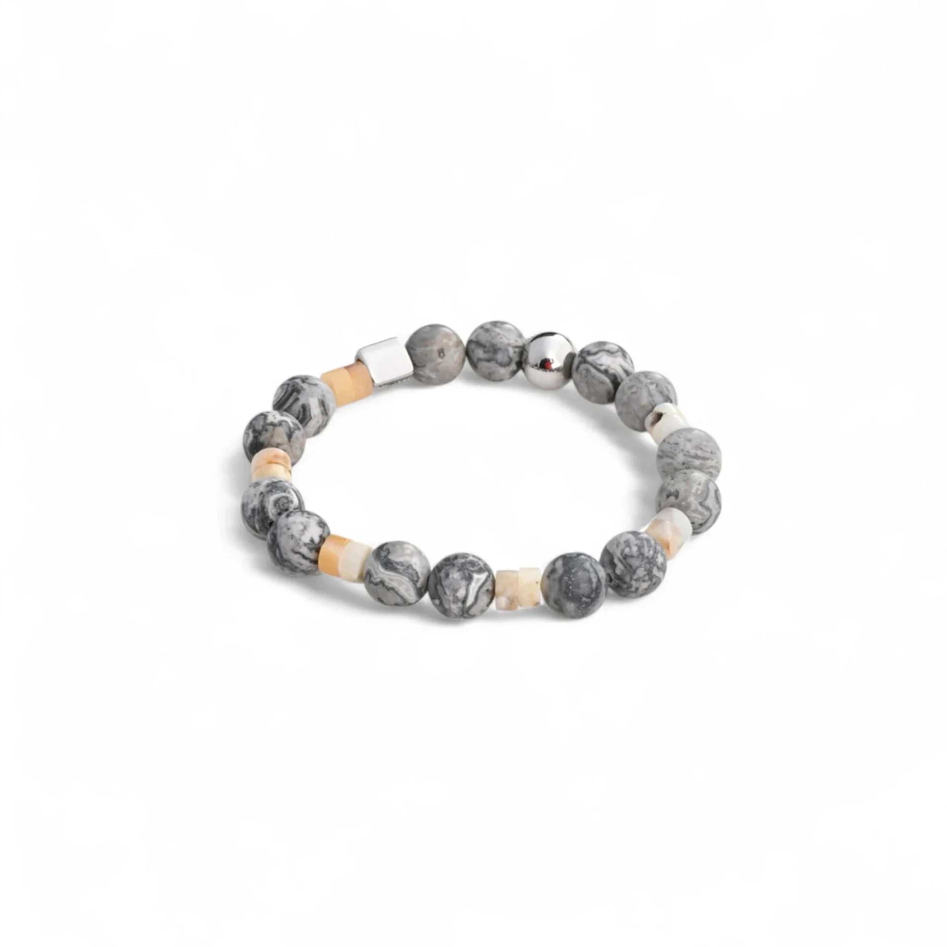 Bracelet pour homme en élastique avec des pierre Ematite terre claire et oeuil du tigre GB en acier inoxydable.