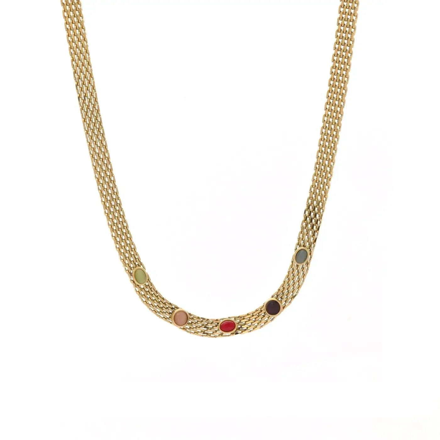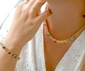 Bijou irrégulier avec trois pierres colorées.