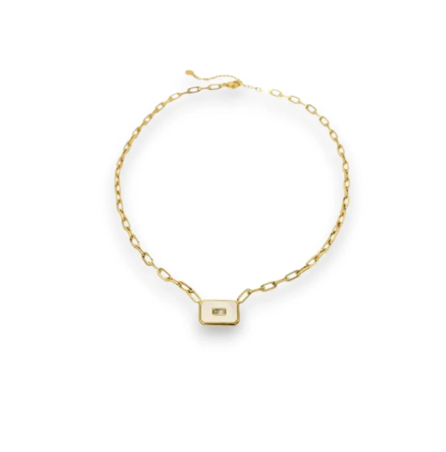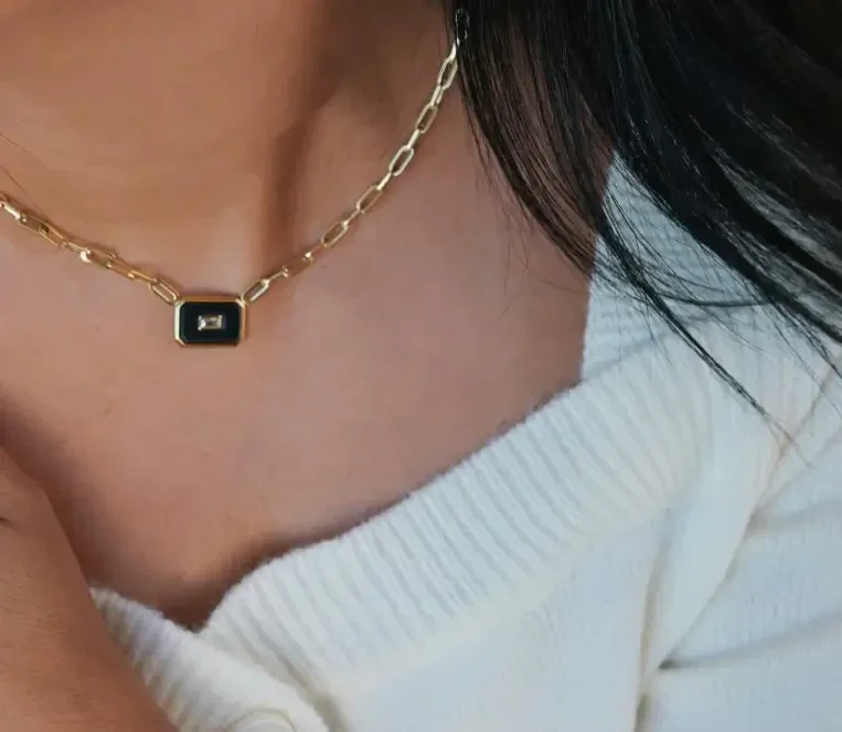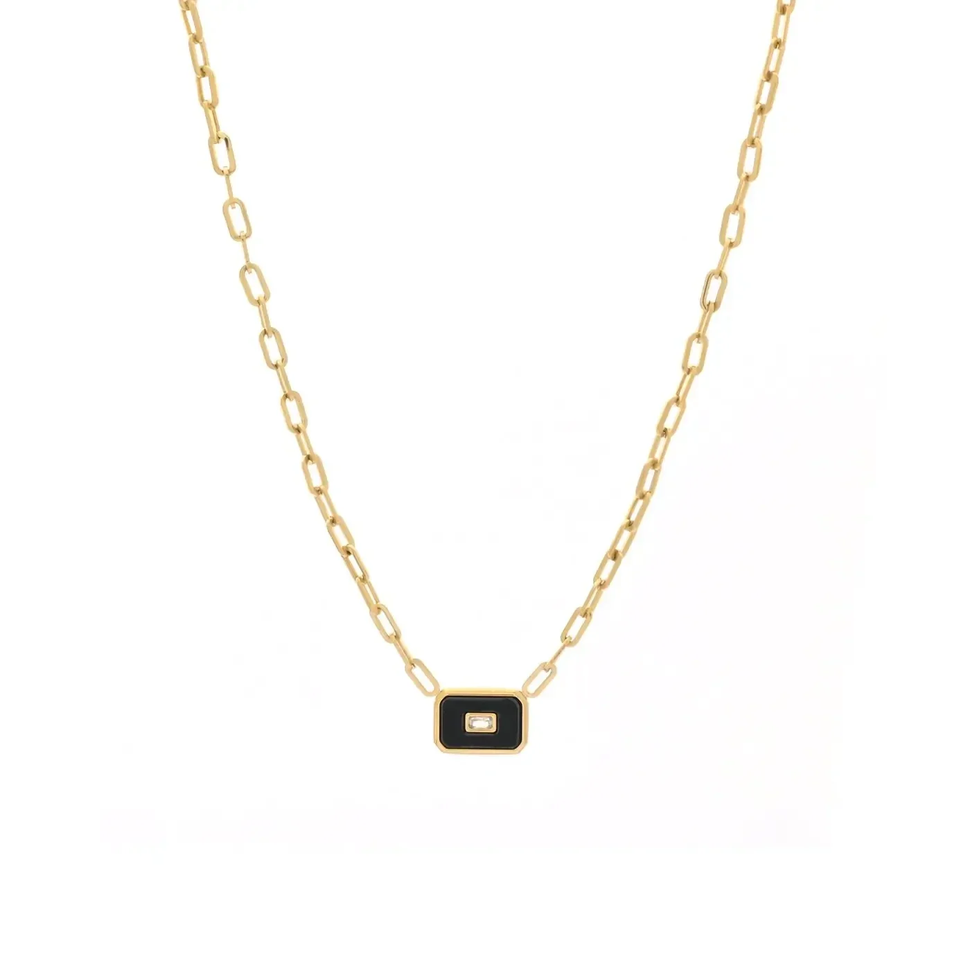 Bijou avec liens et pierre rectangulaire en noir ou en blanc.