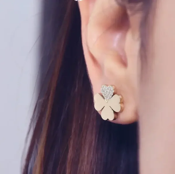 Boucles d'oreilles pour femme et pour fille, en doré et en argenté, en acier inoxydable GB avec un petit trèfle et brillants.