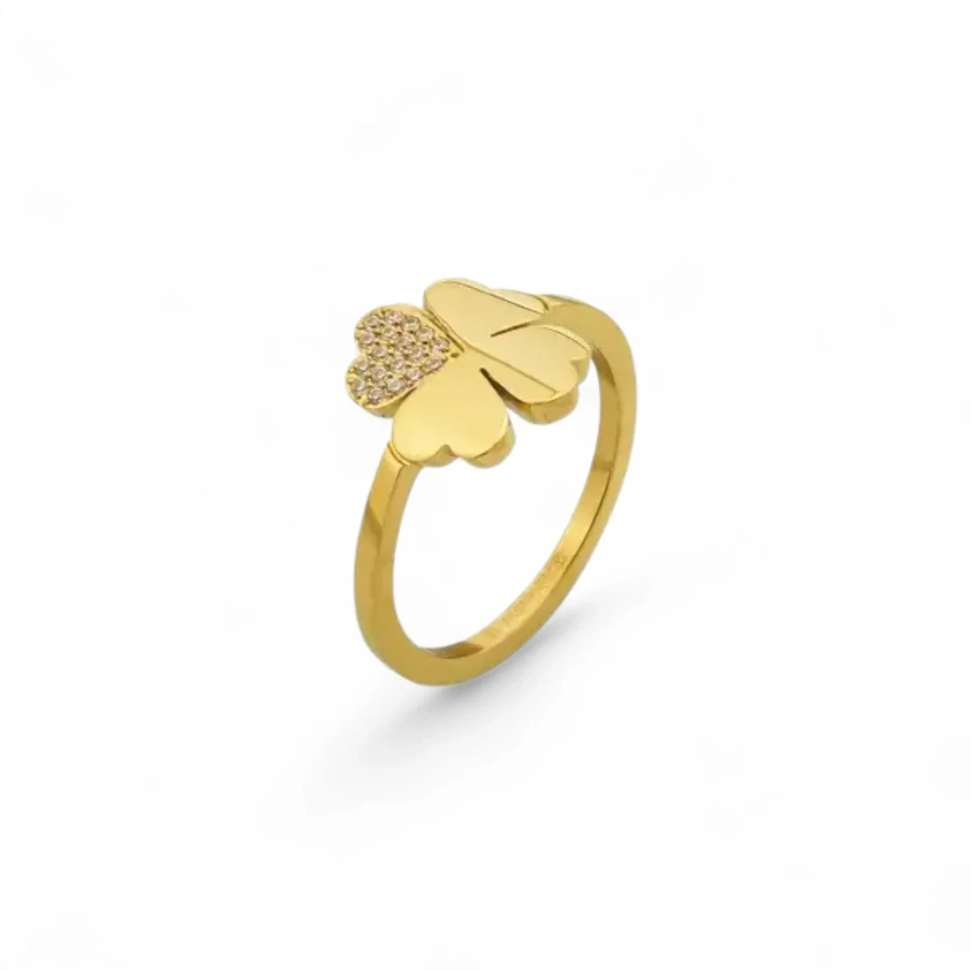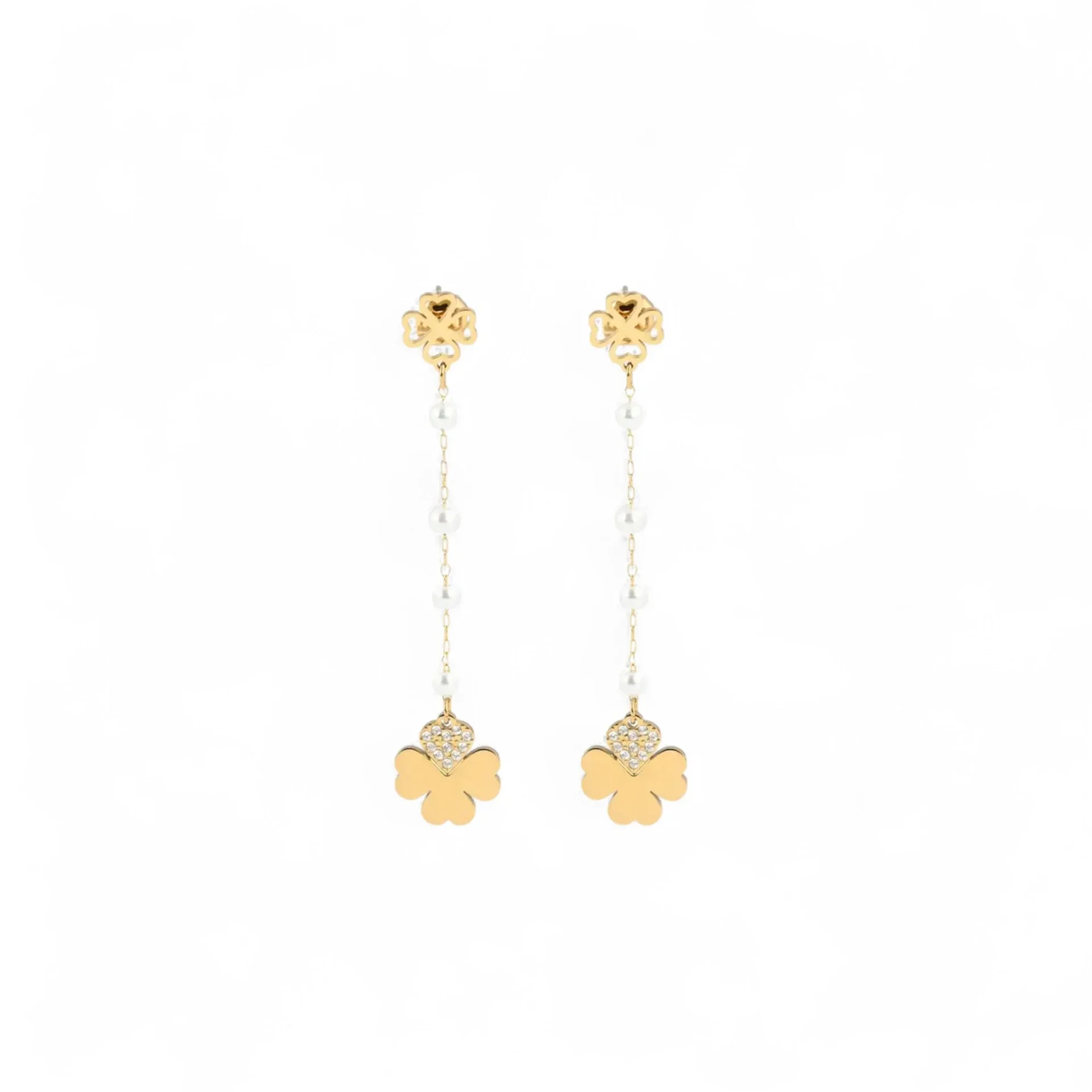 Un bijou avec des perles blanches et un trèfle pendant réglable avec des zircones sur une feuille.