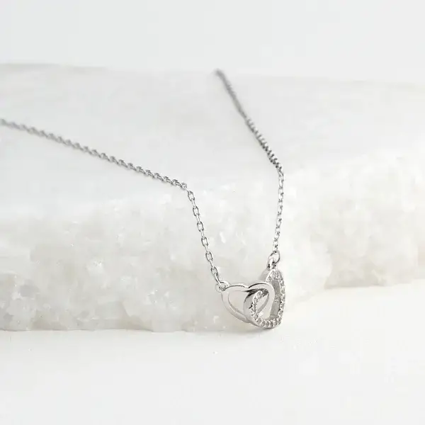 Chaine pour femme GB en argent s925, avec deux coeurs entrelacés certiés de zircones.