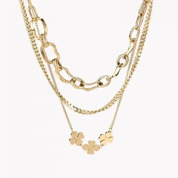 3 bijoux: grosse gourmette nouée, gourmette simple et gourmette avec 3 trèfles lisses.