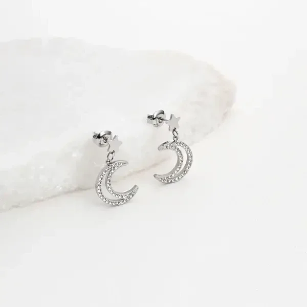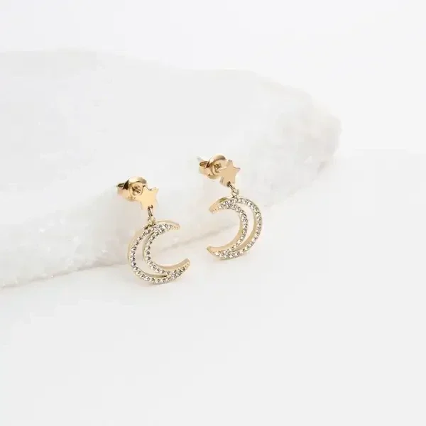 Boucles d'oreilles pour femme en doré et en argenté, en acier inoxydable GB avec lune et étoile suspendues en zircones.