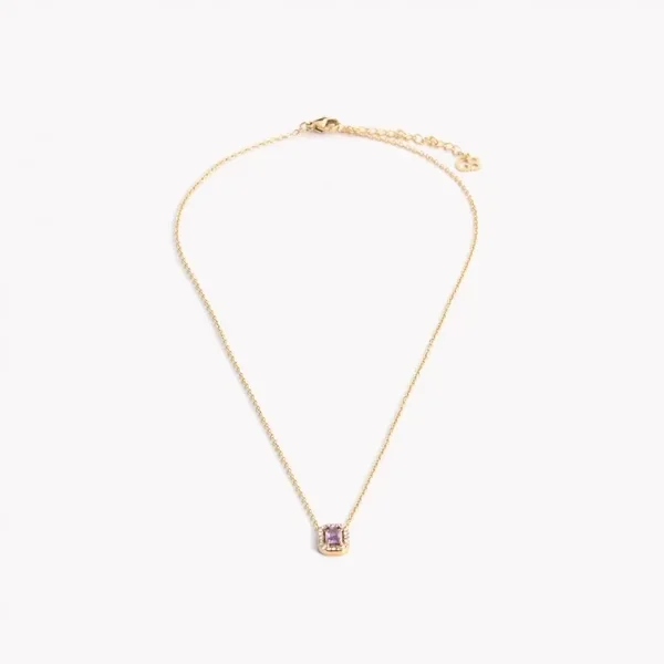 Boucles d'oreilles pour femme en doré, en acier inoxydable GB avec une pierre rectangulaire mauve entourée de petits brillants.