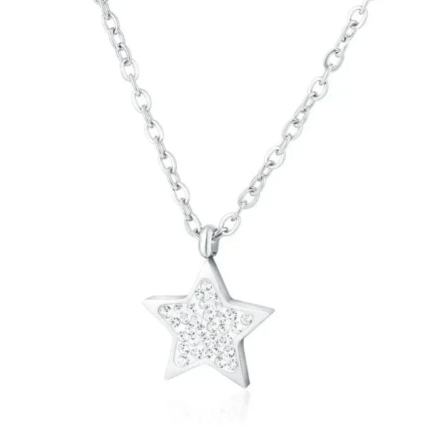 Chaine pour fille et pour femme en acier inoxydable argenté, avec une étoile et une lune en brillants.