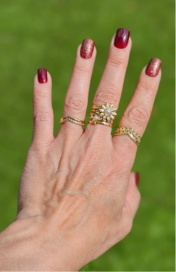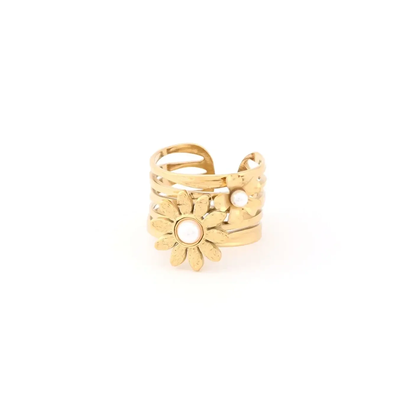 Bague ouverte pour femme en doré, en acier inoxydable GB avec une grande et une petite fleur tournesol orné de mini perles naturelles blanches. Elle est parfaite pour un style autant décontracté que classique.