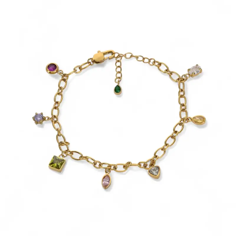 Collier pour femme en doré, en acier inoxydable GB orné de pendentifs en formes géométrique avec des pierres semi précieuses en couleurs.