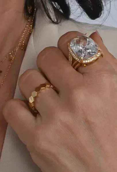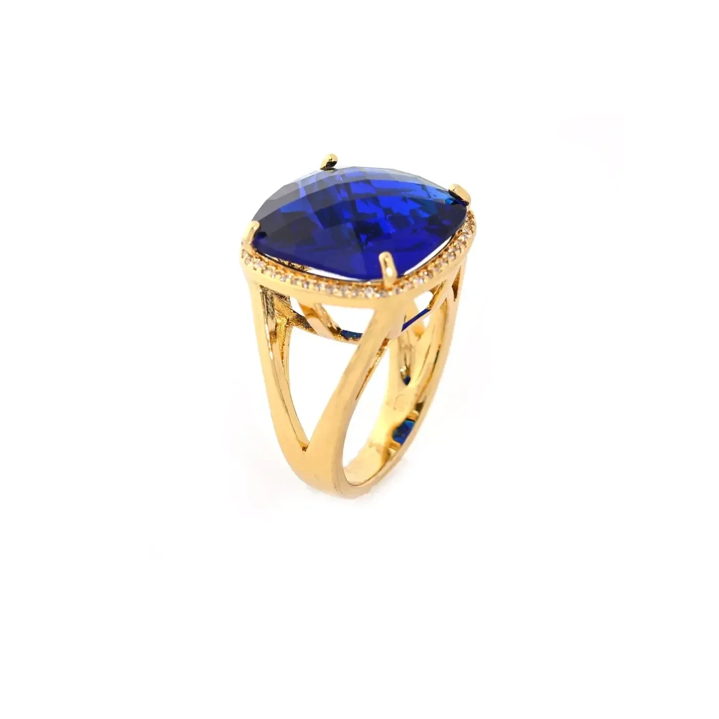 Bague pour femme en doré, en plaqué or GB avec une grosse pierre précieuse en couleur, magnifiquement ornée de petites zirconias.