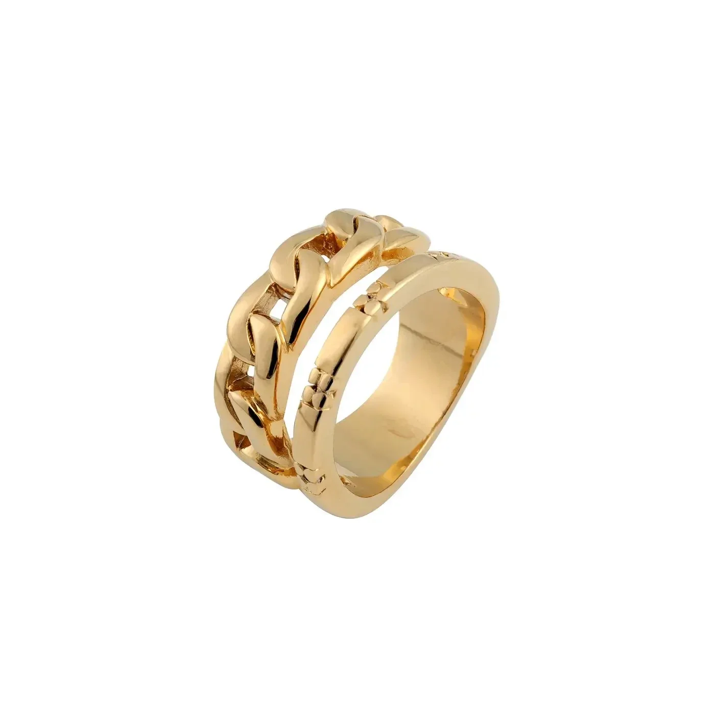 Bague pour femme en plaqué or irrégulier GB, en doré avec double anneaux interconnectés.