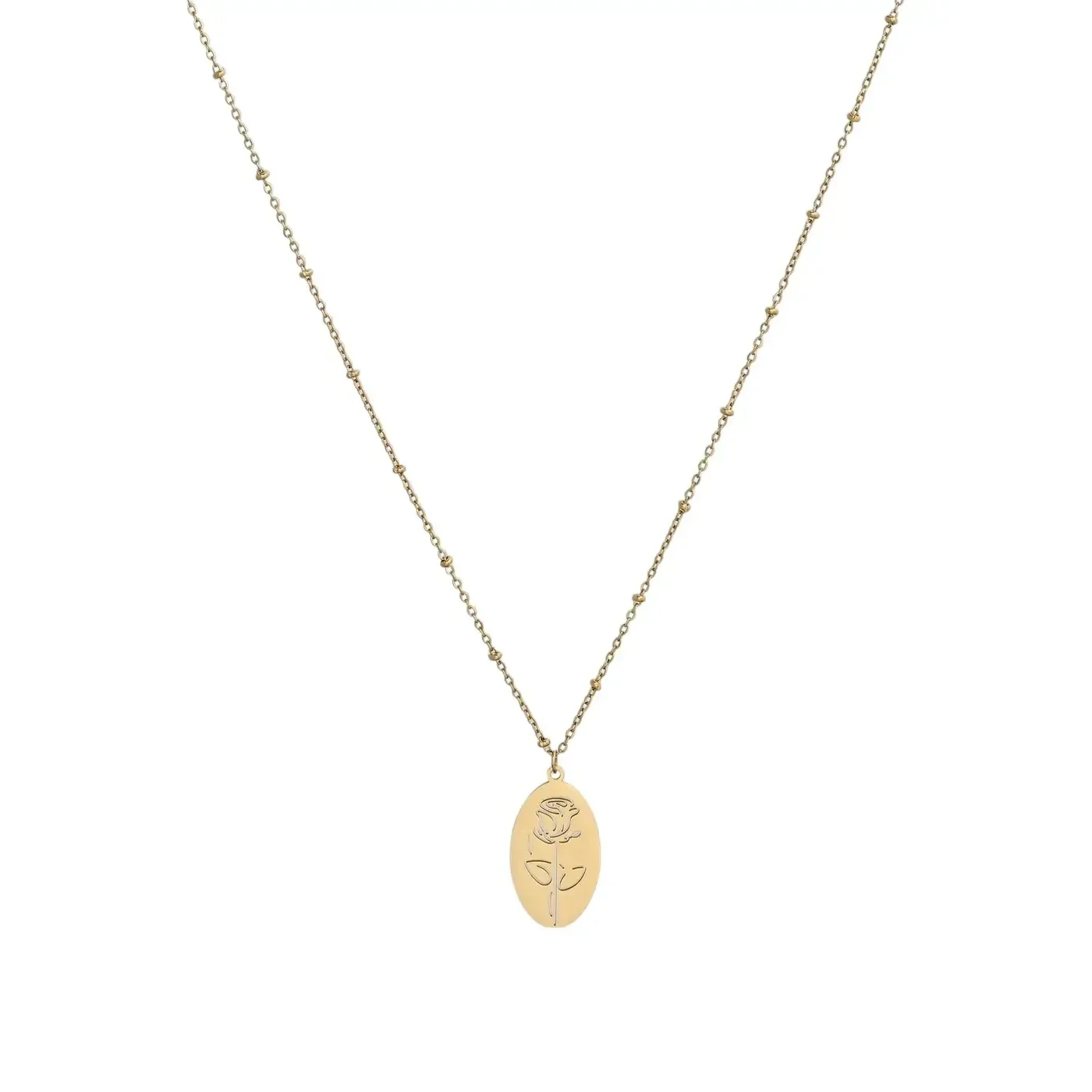 Chaine pour femme et pour fille, en acier inoxydable GB en doré, avec des petites boules et une rose finement gravée sur un pendentif oval.