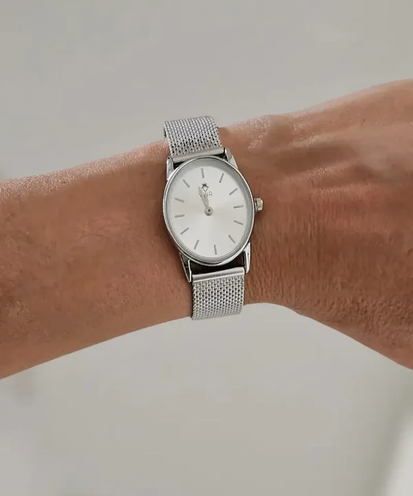 Son bracelet en maille combiné avec son cadran ovale sobre et raffiné donne une touche très classique et chique, il est doté d'un fermoir à bouton-poussoir permettant de fixer, détacher et de le changer facilement.