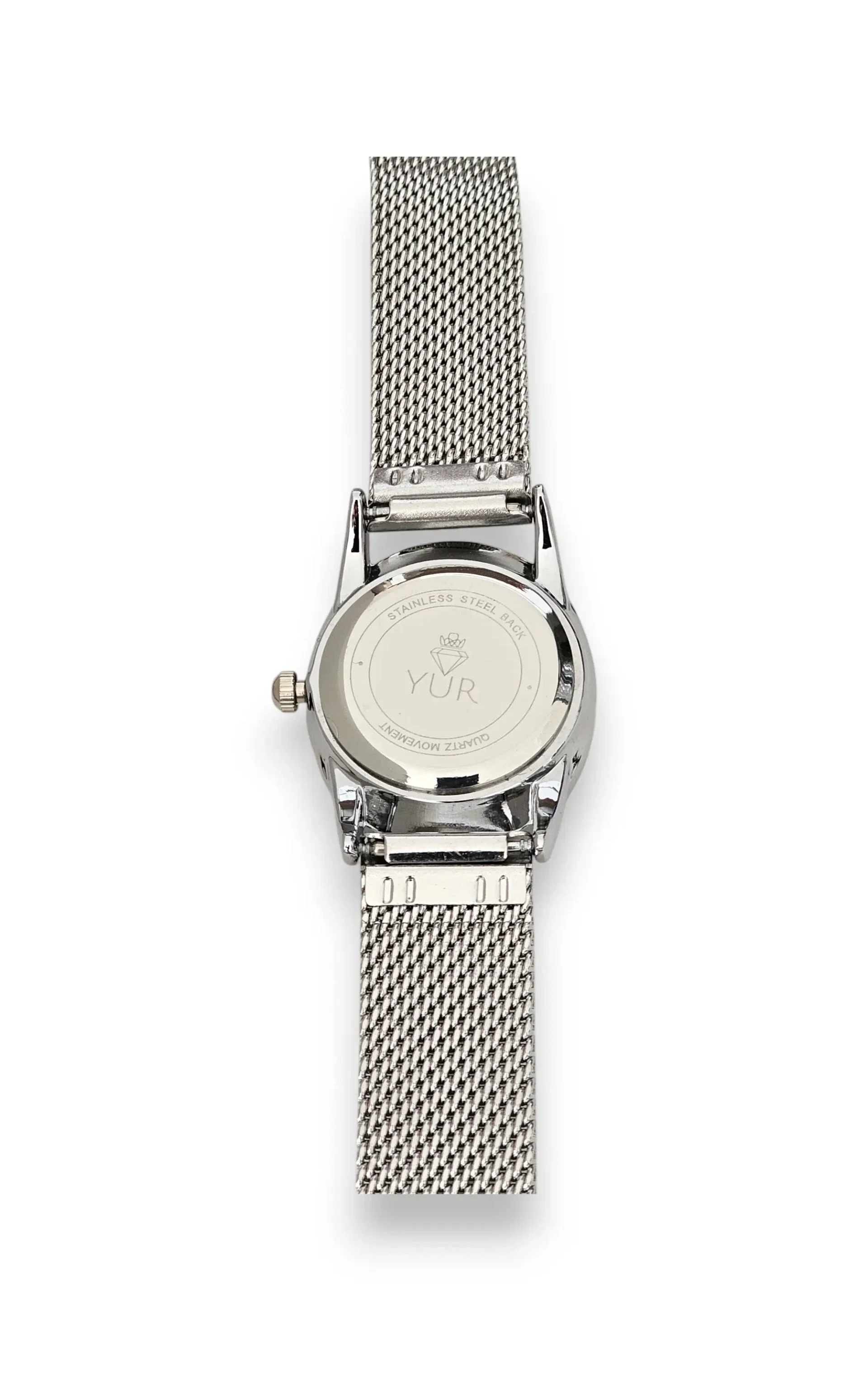 Couleur : doré, argenté et rosé avec cadran blanc. Matériau : acier inoxydable 316L. Cadran : 24 mm Bracelet : bracelet en maille à dégagement rapide. Mouvement : Mouvement japonais.
