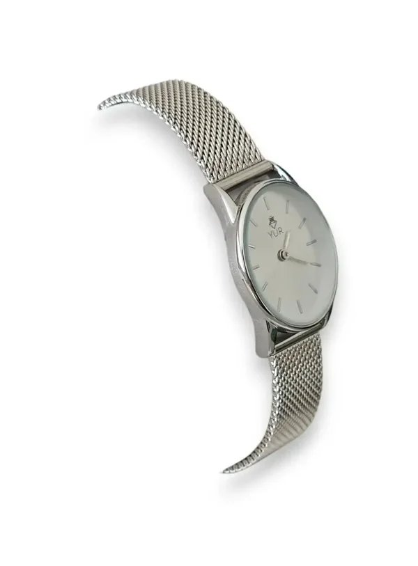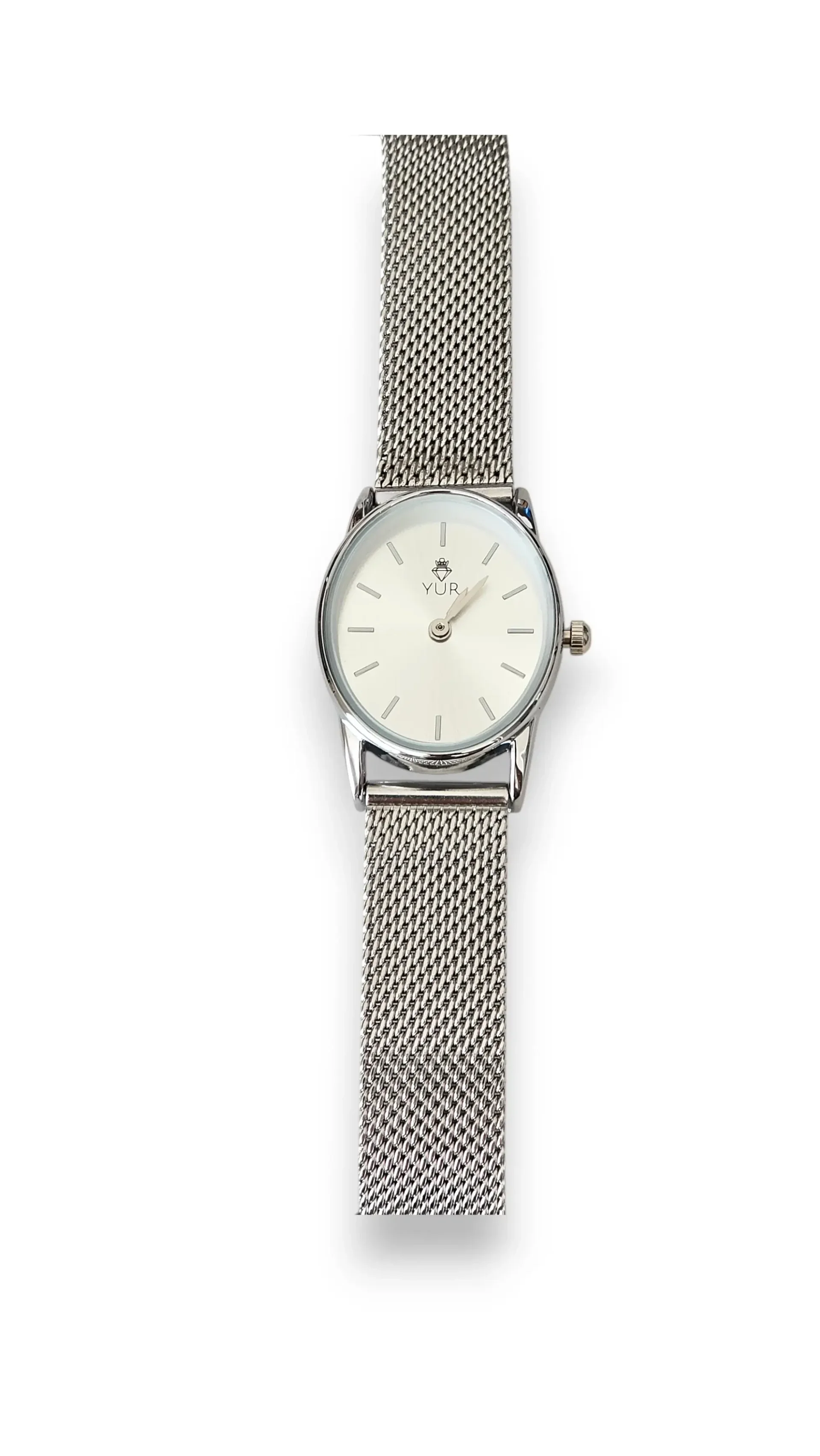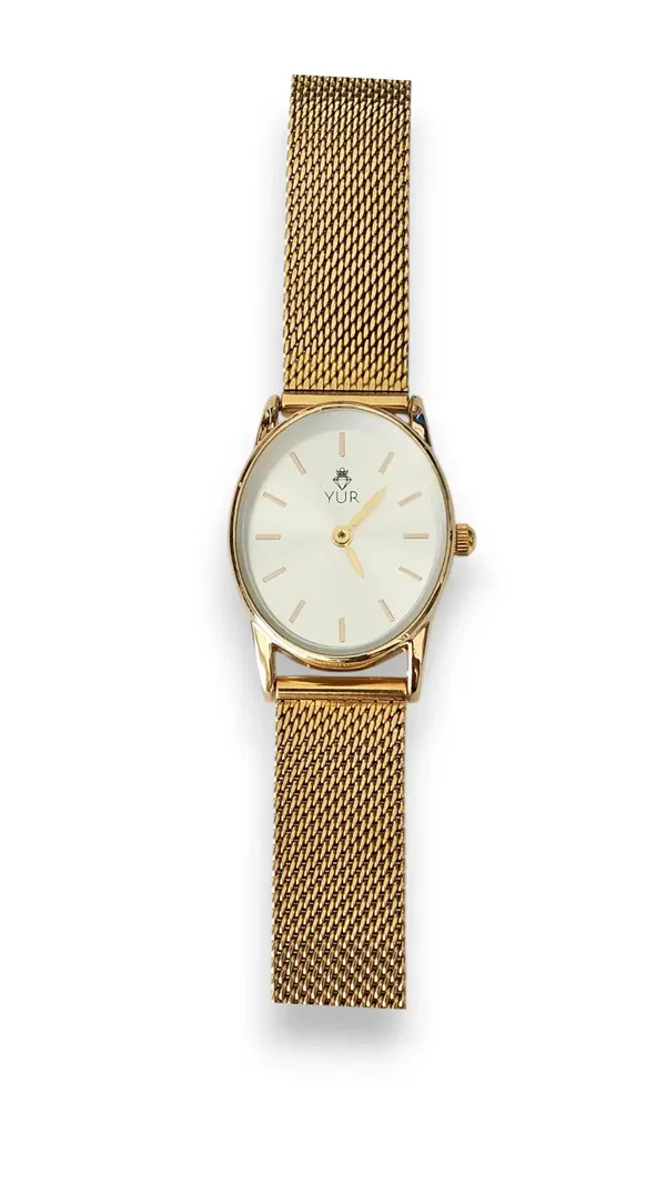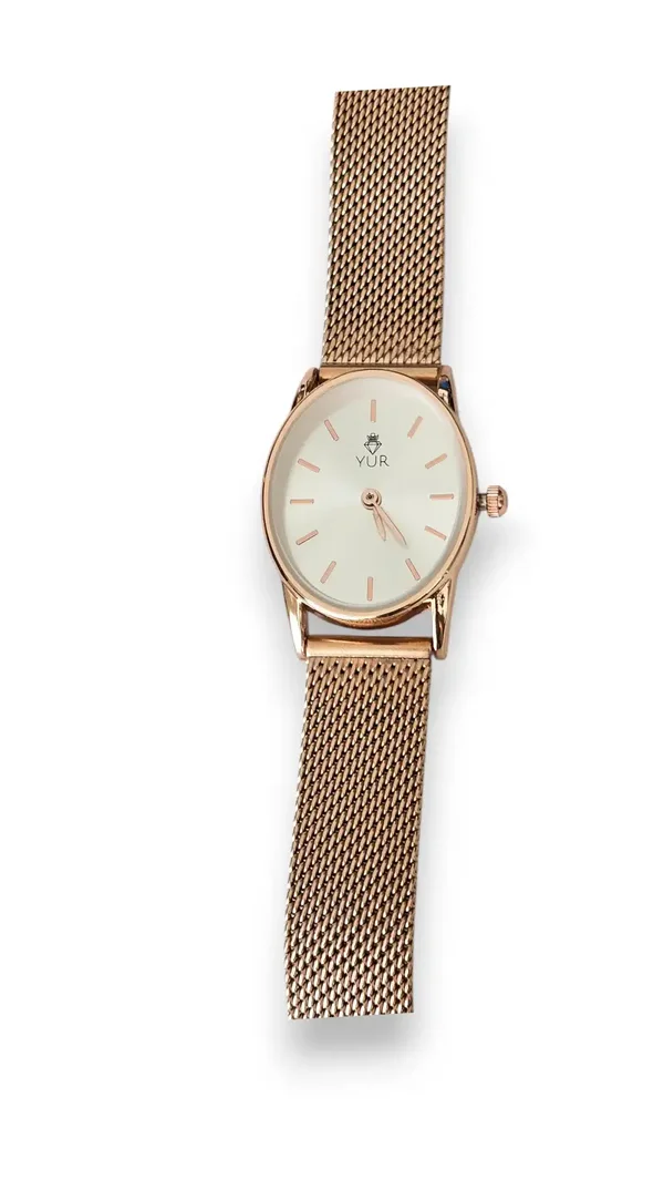 Montre pour femme YUR en maille en doré, rosé et agrenté avec un cadran ovale blanc.