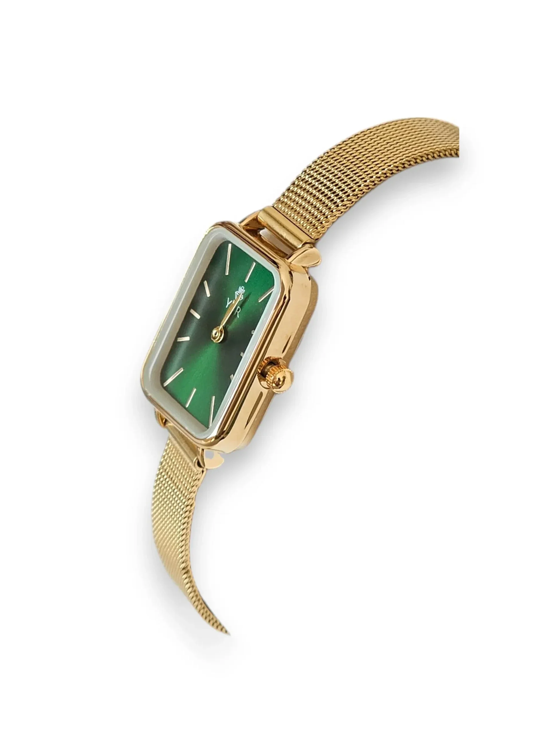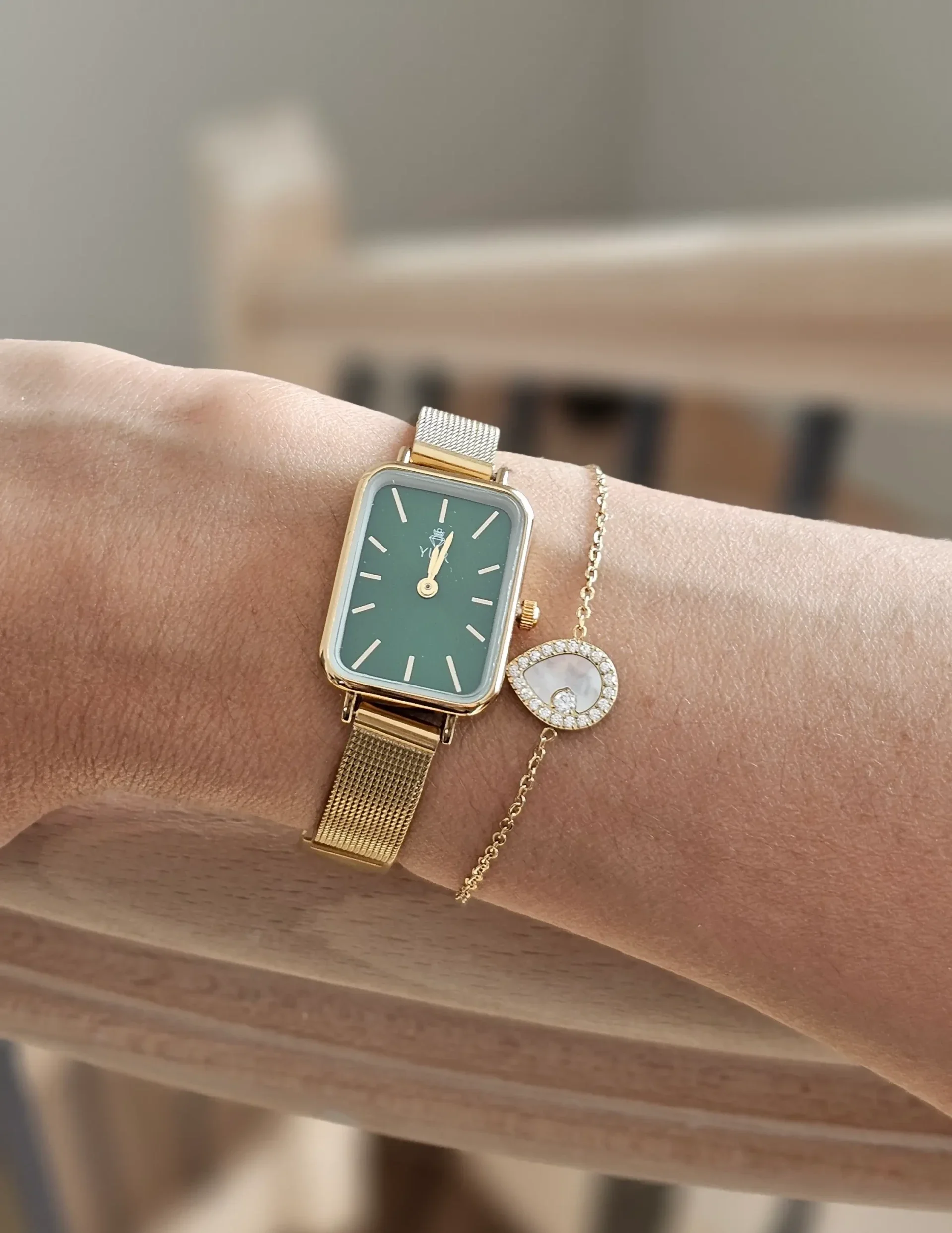 Montre pour femme YUR en maille en doré avec un cadran vert et blanc.