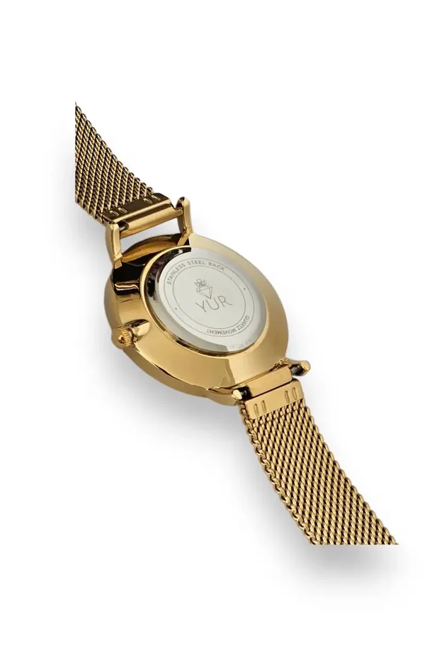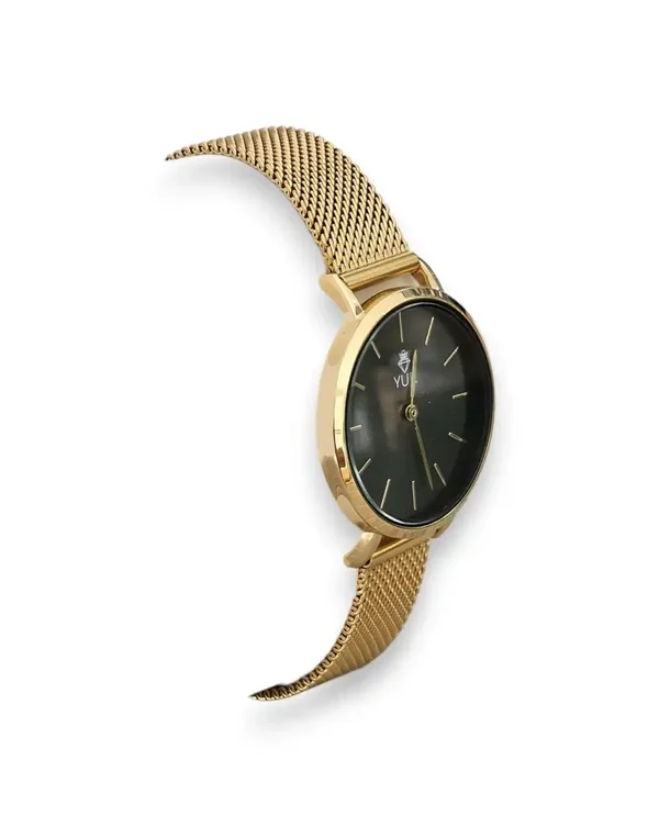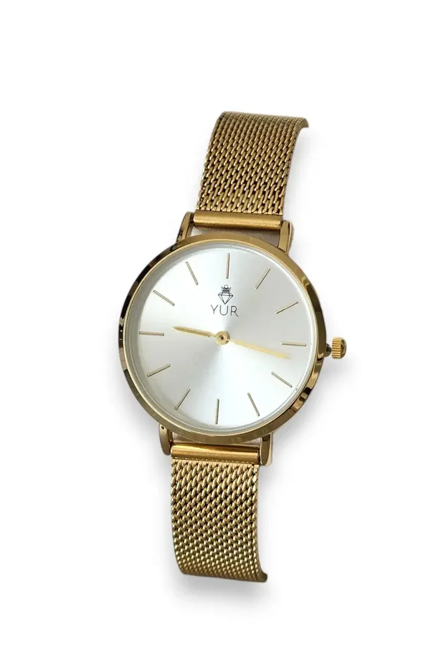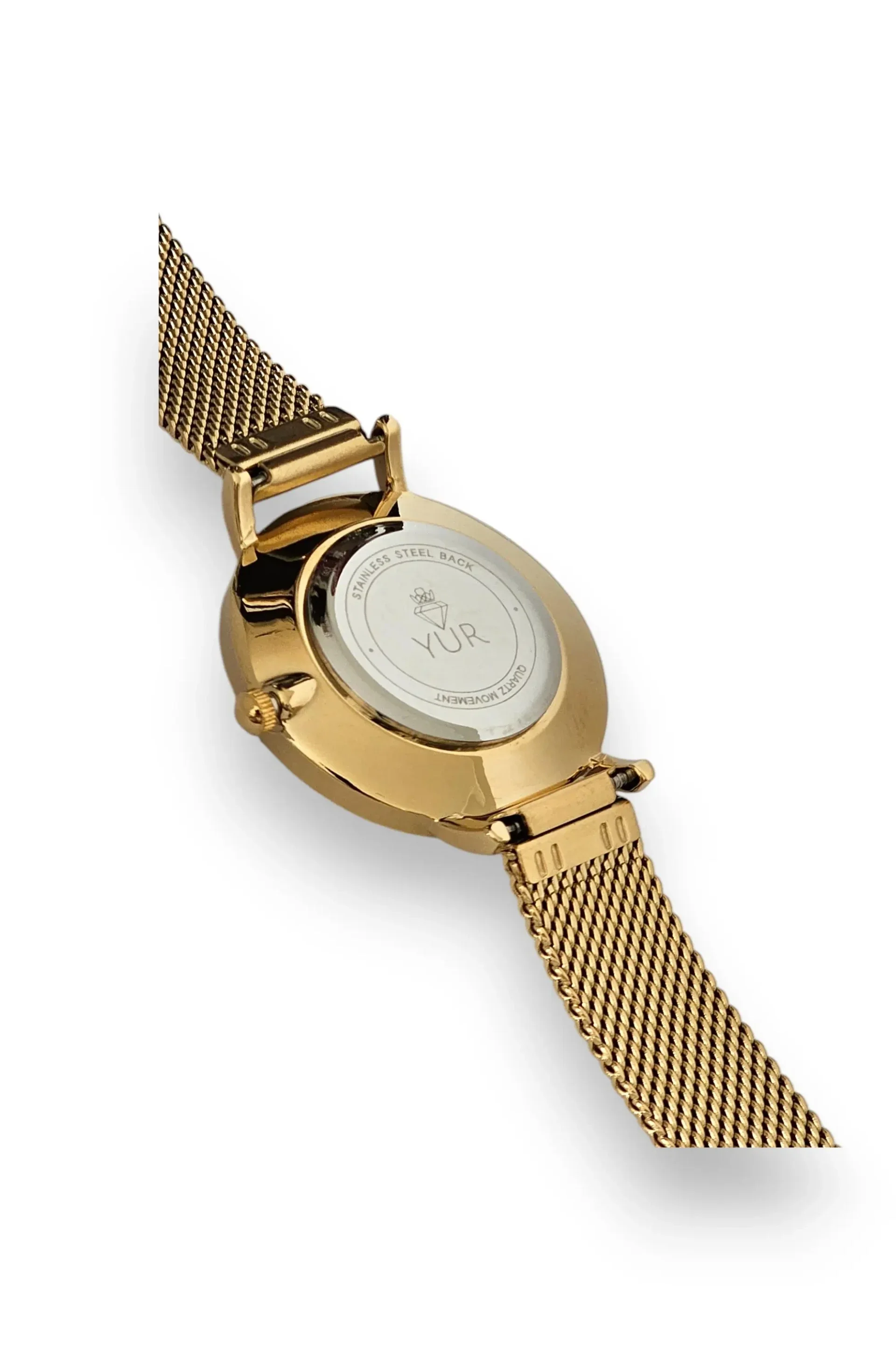 Montre pour femme ou pour homme YUR en maille gold avec un cadran couleur blanc et noir.
