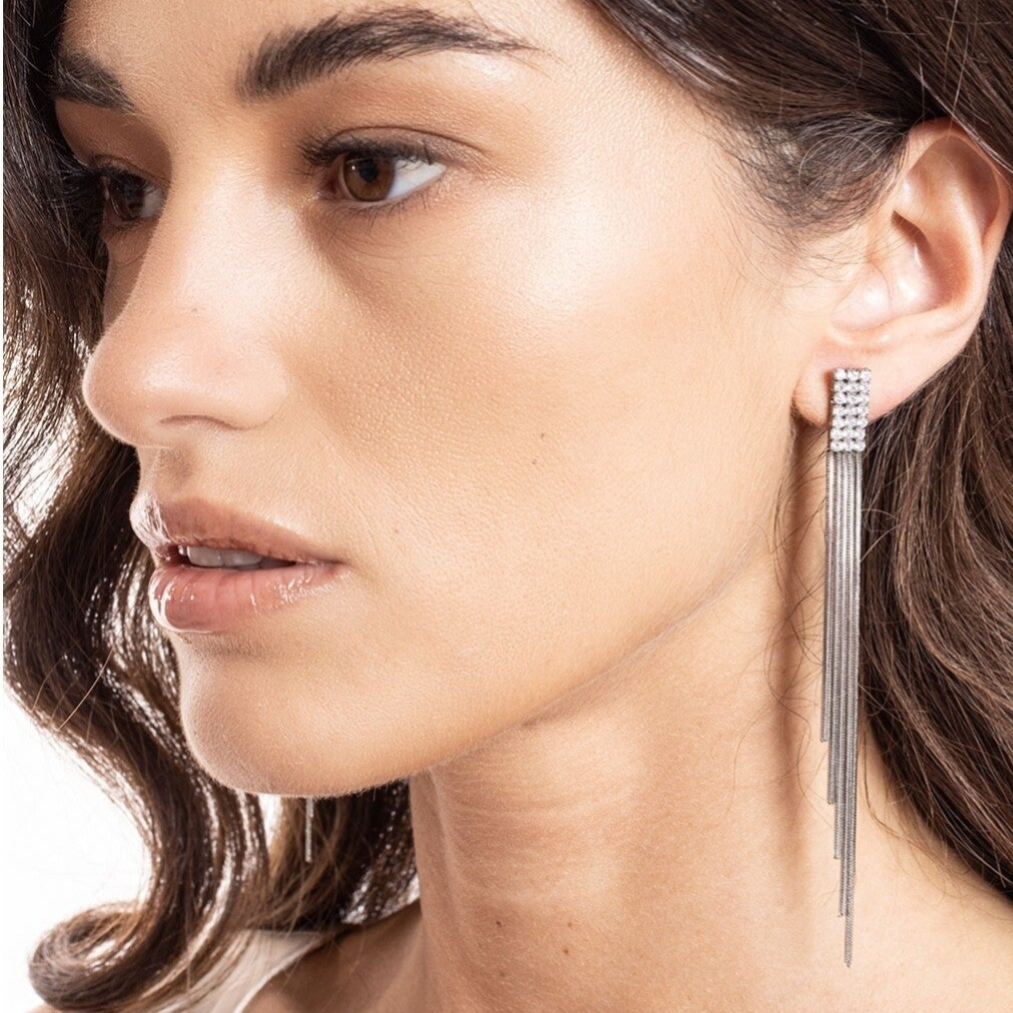 Boucles d'oreilles pour femmes en acier inoxydable en argenté pendantes, certiées de pierres zircones donnant un aspect très élégant et chic.