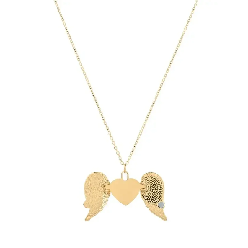 Collier pour femme et pour fille, en acier inoxydable en doré et en argenté, avec un pendentif ailes d'ange aimantées sur une petit coeur lisse.