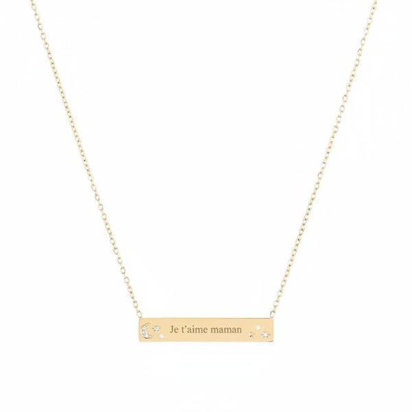 Collier pour femme et pour fille en doré, en acier inoxydable en forme réctangle avec de très beaux motifs certiés de zircones: Lune et étoiles.