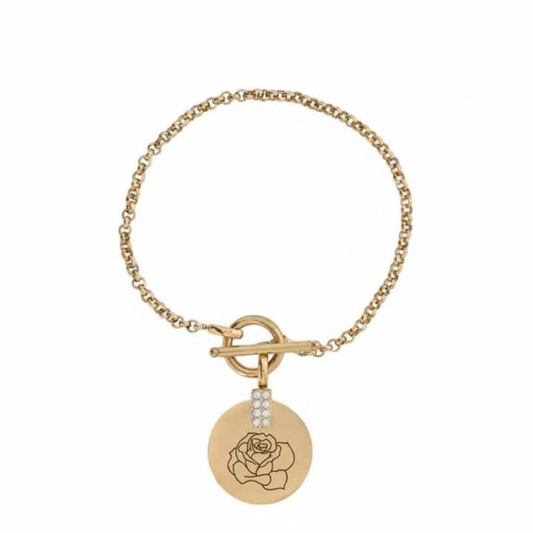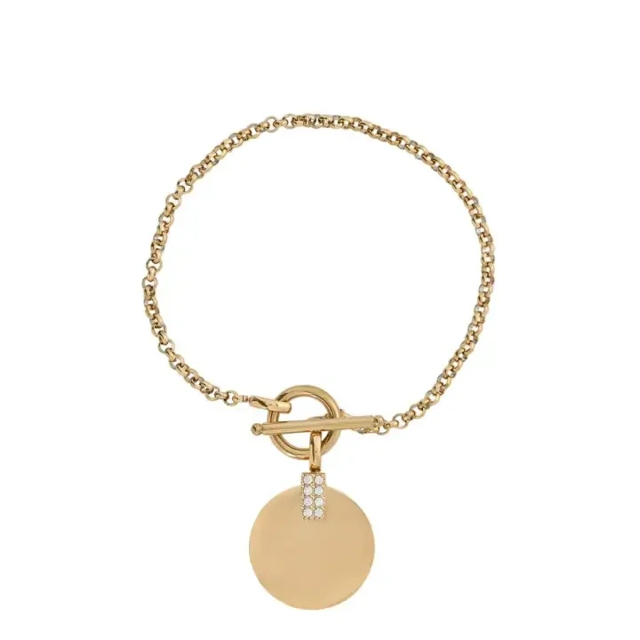 Bracelet pour femme en doré et en argenté, en acier inoxydable avec un pendentif médaille certié de petites pierres zircons, la chaine est en maille moyenne avec fermoir boucle.