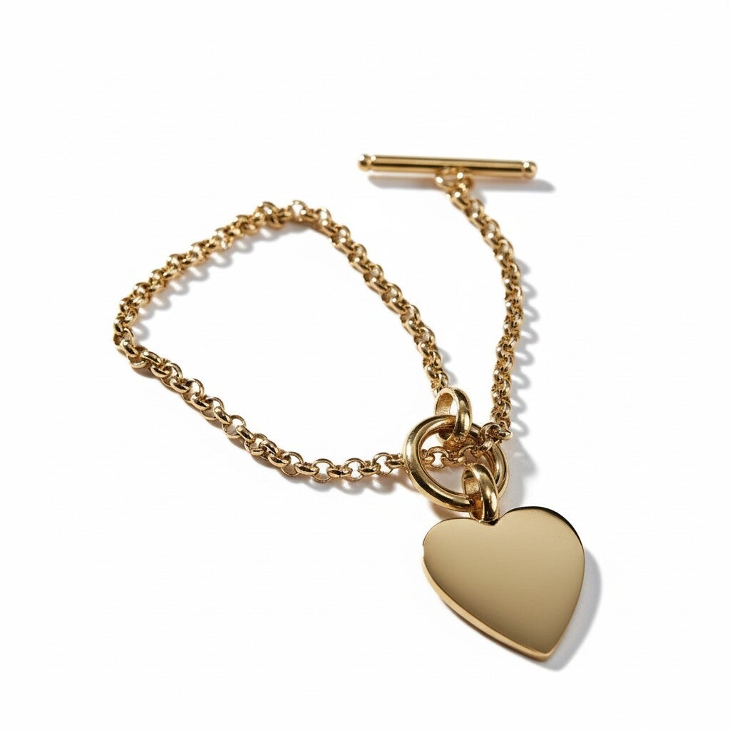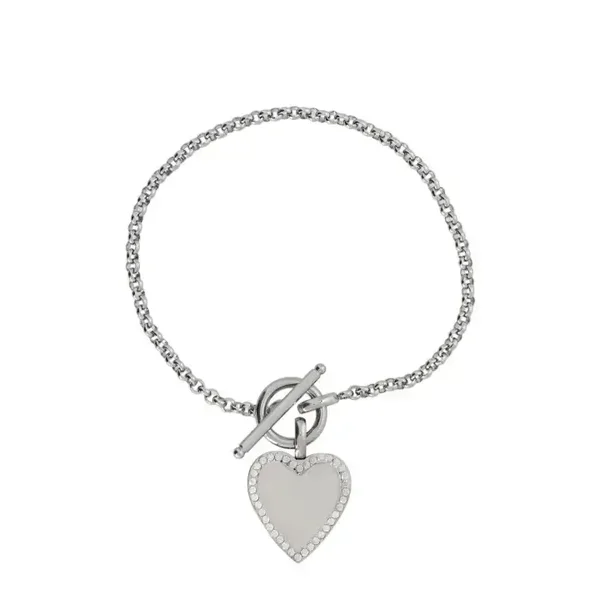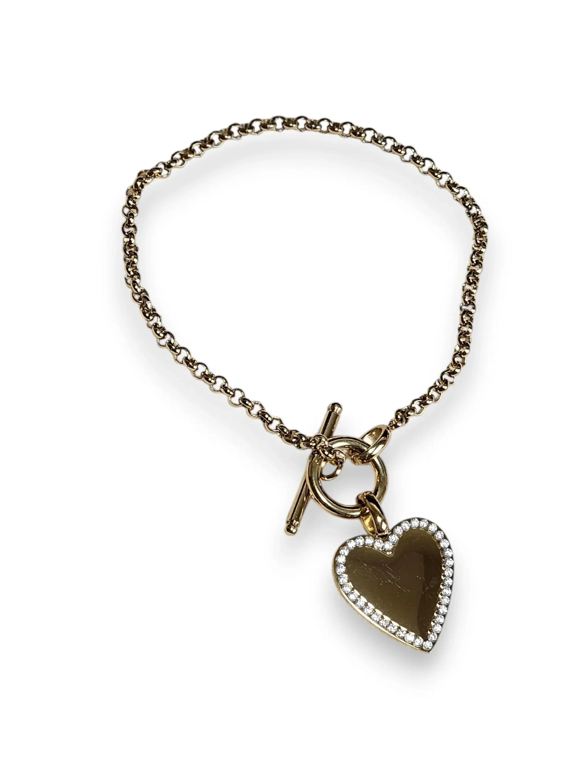 Bracelet pour femme en doré et en argenté, en acier inoxydable avec un pendentif coeur certié de petites pierres zircons, la chaine est en maille moyenne avec fermoir boucle.