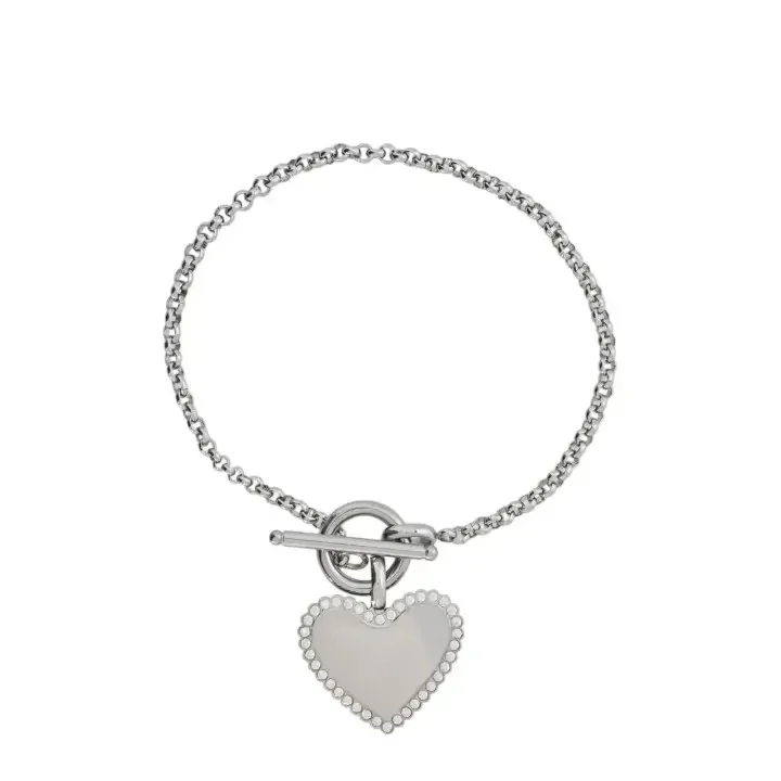 Bracelet pour femme en doré et en argenté, en acier inoxydable avec un pendentif coeur large certié de petites pierres zircons, la chaine est en maille moyenne avec fermoir boucle.